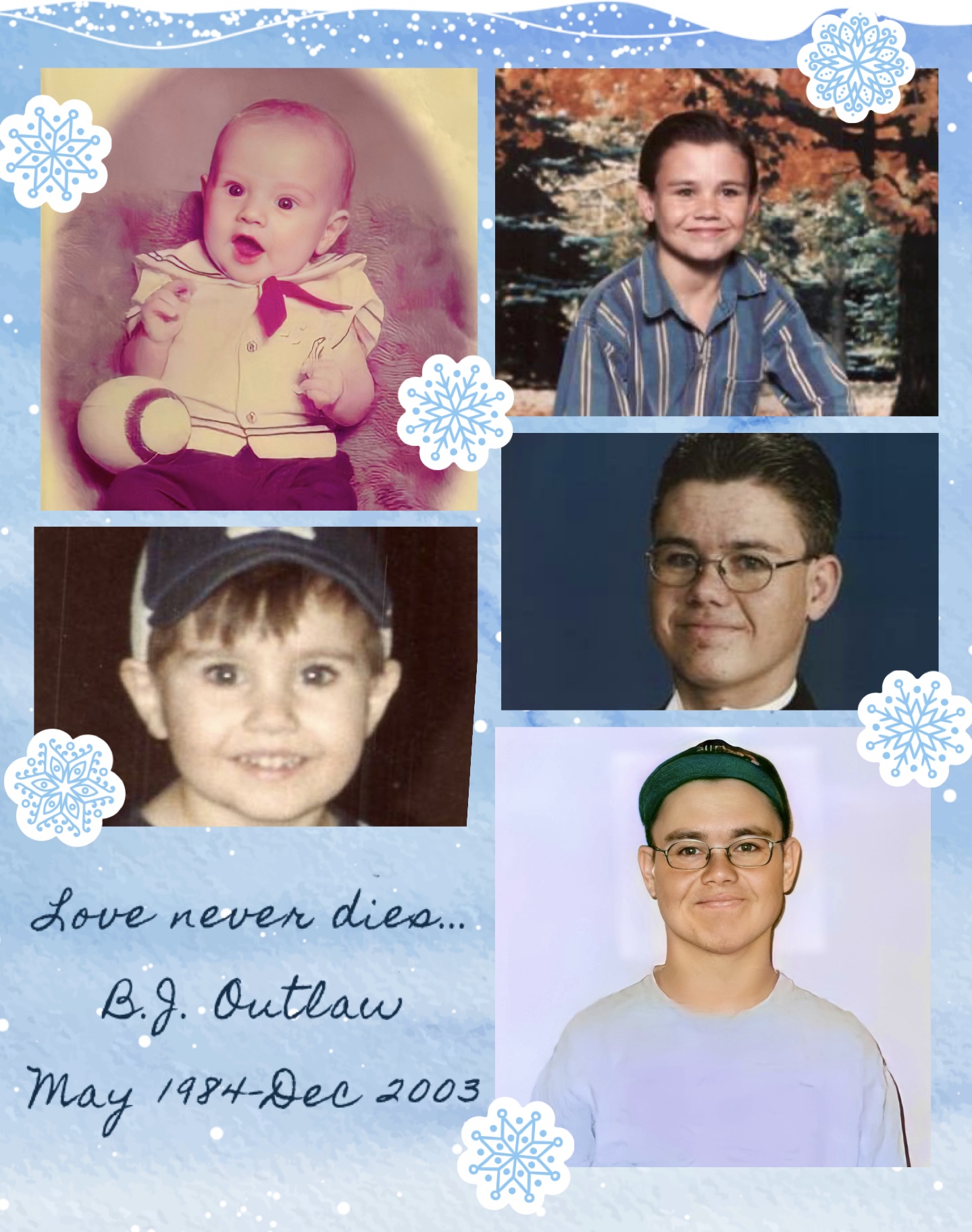 created in the memory of our beloved son and brother Bobby J. Outlaw II. B.J. was born on May 17, 1984 in Ft.Worth Texas. He passed away on Dec. 1, 2003 in Waco Texas at the young age of 19 yrs. He still lived at home with his family in Goldthwaite Texas when Jesus called him to his new home in Heaven.